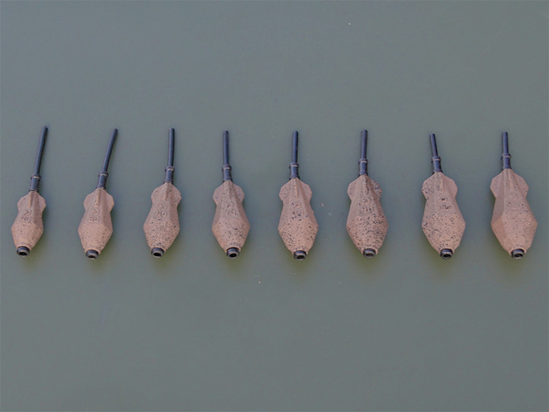 Το αεροδυναμικό σχήμα μιας εσωτερικής σχισμής με ένθετο σωλήνα έχει σχεδιαστεί για ελάχιστη αντίσταση. Αντικαταστήσαμε τα στρογγυλά σχήματα με γωνιακά για να δημιουργήσουμε ένα πιο συμπαγές βυθιστή. Τα μικρά φτερά στα πλάγια εξασφαλίζουν σταθερότητα κατά τη διάρκεια της πτήσης, παρατείνουν την απόσταση ρίψης και εγγυώνται τη συνοχή των αρματωσιών σας. Κατά τη ρίψη, ο σωλήνας εμποδίζει το μπλέξιμο. Η επιφάνεια του βαριδιού είναι επικαλυμμένη με φυσική όψη καφέ χρώμα με μαύρα στίγματα για καλύτερο καμουφλάζ στο κάτω μέρος.