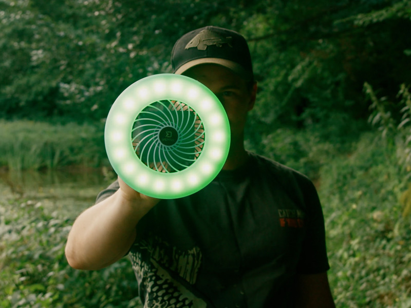 Delphin Ventix can be mounted in various positions as needed. On the back is a practical handle that serves as a stand for stable placement. A foldable hook is hidden in the handle, allowing easy hanging in a bivvy, tent, or on a branch. For even more mounting options, Ventix is also equipped with a strong magnet for attaching to metal surfaces.
