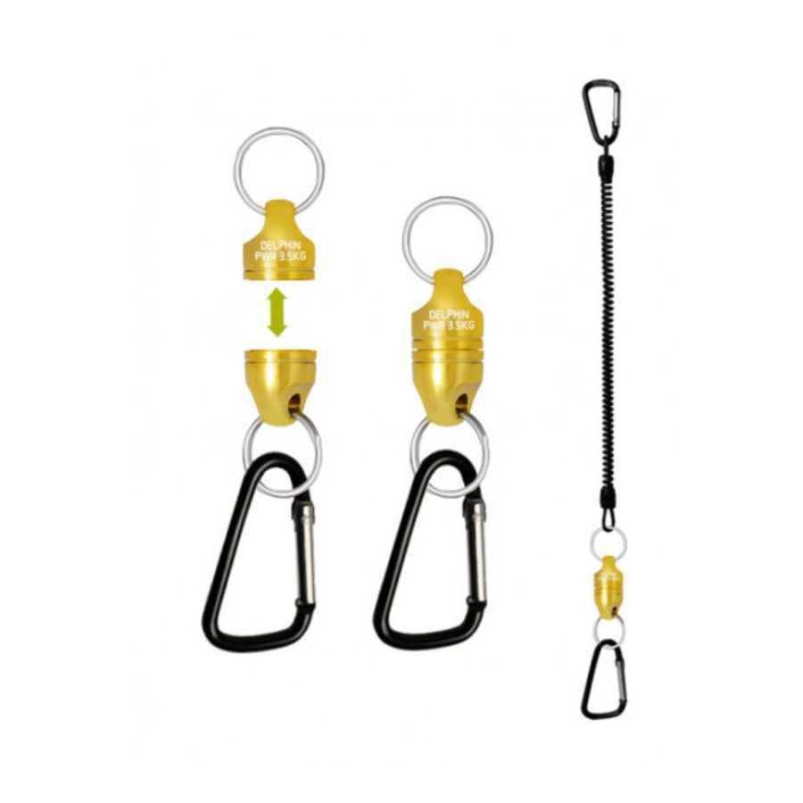 Πραγματικά πρακτικό αξεσουάρ για ψαράδες, που θέλουν να έχουν ένα δίχτυ προσγείωσης πάντα έτοιμο. Σε σύγκριση με το προηγούμενο μοντέλο του έχουμε βελτιώσει τη σχεδίαση και χάρη στο εντυπωσιακό του χρώμα δεν θα είναι πρόβλημα να κατευθύνουμε τα δύο κομμάτια το ένα προς το άλλο μέσω ενός εξαιρετικά ισχυρού μαγνήτη με φέρουσα ικανότητα από 3,5 kg έως 1 cm2. Αυτός ο μαγνήτης στερεώνεται σε ένα κούμπωμα με χαλύβδινο βρόχο. Όλα αυτά μαζί το καθιστούν ένα χρήσιμο πρόσθετο αξεσουάρ που είναι πάντα προετοιμασμένο για μια δράση. Έρχεται σε συσκευασία με ελαστική λωρίδα από καουτσούκ (10-85 cm) που μπορεί να χρησιμοποιηθεί για την τοποθέτηση οποιουδήποτε άλλου αξεσουάρ όπως λαβίδα ή πένσα.