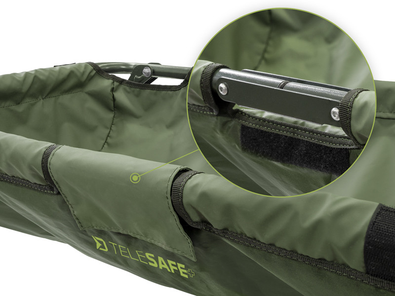 The base of the cradle TeleSAFE+ is a 22 mm solid metal construction. The rubber coating also has several advantages. It is very easy to clean and it dries quickly, all you need to do is to wipe it. Plus, it doesn’t absorb any odours, so you can safely transport it in your car. The cradle is very sturdy, since it was able to withstand up to 75 kg of static weight during extreme testing! There is a mesh fabric on both ends to drain any excess water. TeleSAFE+ also has a cover attached with velcro zip. It allows you to safely keep your fish inside while you prepare your camera, or fetch the water to pour it over the fish. Telescopic mud feet won’t let the cradle get stuck in a mud. Another strong side of this product is easy transport. The construction is divided in the middle, so it’s very easy to fold it in half and carry it around.