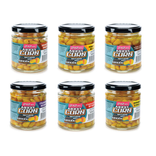 Canned corn in glass jars of 212 ml. It is characterized by an optimal balance of hardness, soft enough to be rigged on a hook or hair, and hard enough to stay on the rig for the long time.